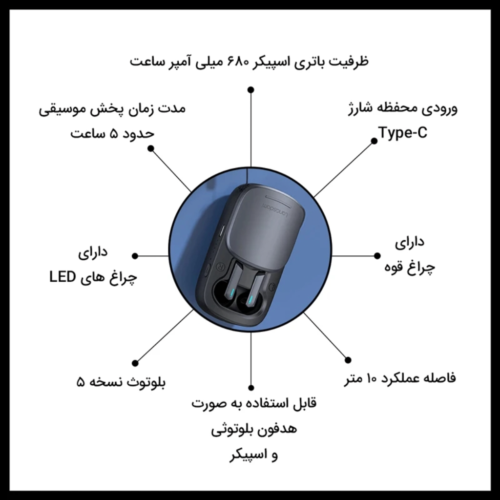 دارای اسپیکر قوی - سبک و قابل حمل - دارای چراغ قوه - دارای چراغ های LED نمایشگر شارژ - طراحی ارگونومی گوشی ها - اتصال پایدار - بلوتوث ورژن ۵ - گوشی های بسیار کوچک (مناسب مکالمه. موزیک و بازی) - برد حدود ۱۰ متر - برند معتبر لانگسدوم - مدت زمان پخش اسپیکر ۱۰ ساعت - مدت زمان پخش هدفون ۵ ساعت -