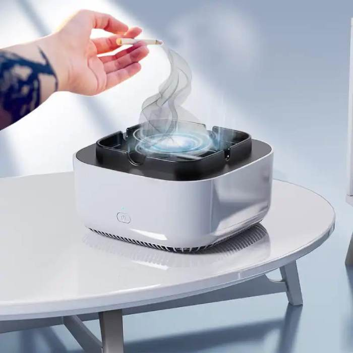 سیگار به اندازه کافی برای ما مضر است ولی با این حال نیمی از ضرر دود سیگار متوجه اطرافیان ماست.این محصول با جذب دود سیگار و فیلتر کردن آن، تا حدود زیادی بوی ناخوشایند و سموم سیگار را فیلتر میکند و مانع از ضرررسیدن به اطرافیان میشود.زیر سیگاری الکتریکی مکنده دود دارای فن مکنده دود سیگار ،محل قراردادن سیگار روشن و همچنین محل ریختن خاکستر و ته سیگار است و با دارا بودن 3 فیلتر مختلف غبار گیر و کربن اکتیو ابری و کربن اکتیو فشرده، بوی سیگار و دیگر بوهای محل را میگیرد که نقش بوگیر و تصفیه هوا را دارد.همچنین این فیلتر ها باکتری و گرد و غبار را نیز فیلتر میکنند.در اینصورت شاهد هوایی پاکتر برای خود و اطرافیان خواهید بود.این محصول نیازی به برق ندارد و با دو عدد باتری قلمی مدت زیادی کار میکند.همچنین جنس بدنه از پلاستیک ABS میباشد و میتوان در آن از رایحه های خشبو کننده نیز استفاده کرد.