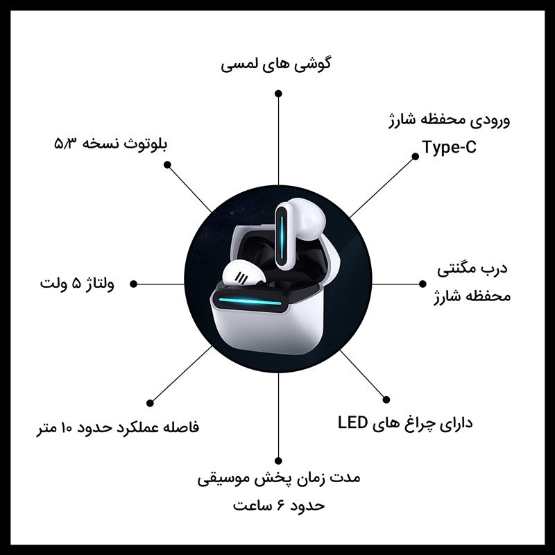 برند معتبر لانگسدوم - دارای قابلیت حذف صداهای مزاحم (ENC) - دارای دو حالت پخش موسیقی و گیم - دارای چراغ های LED جذاب روی کیس و روی گوشی ها - ولتاژ ۵ ولت - مدت زمان پخش موسیقی ۶ ساعت - درب مگنتی محفظه شارژ - مناسب برای گیمرها - باتری با طول عمر بالا - قابلیت مکالمه - کیفیت بالای پخش صدا - طراحی خاص و جذاب
